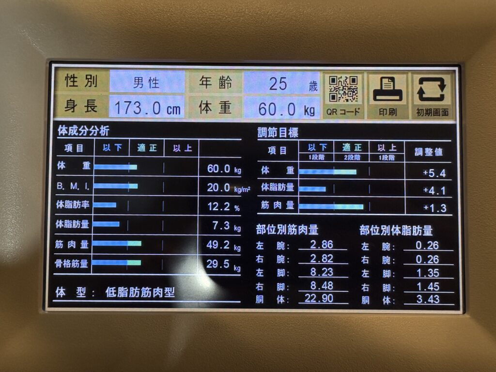 オナ禁が肉体的にも効果があるのかを検証するためにも1日目にジムで測った体成分分析の写真も乗っけておきます。